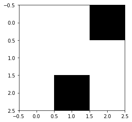 (3) 学習用入力信号 data_training は以下の 3x3, 1 bit画像データ 5 つから作成する(黒が 0 、白が 1)