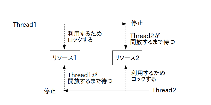 thread1 開始 リソース1 ロック リソース2 ロック リソース1 ロック解除 リソース2 ロック解除 thread1 終了 thread2 開始 リソース2 ロック リソース1 ロック リソース1 ロック解除 リソース2 ロック解除 thread2 終了